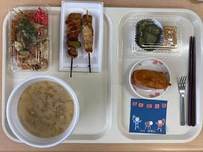 ソース焼きそば(いなり寿司)、やきとり、豚汁、梅肉和え、水ようかん