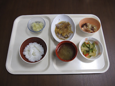 献立:豚肉のオニオンソースがけ、アスパラとポテトのソテー、ビーンズサラダ、フルーツ缶(白桃)、コンソメスープ、米飯